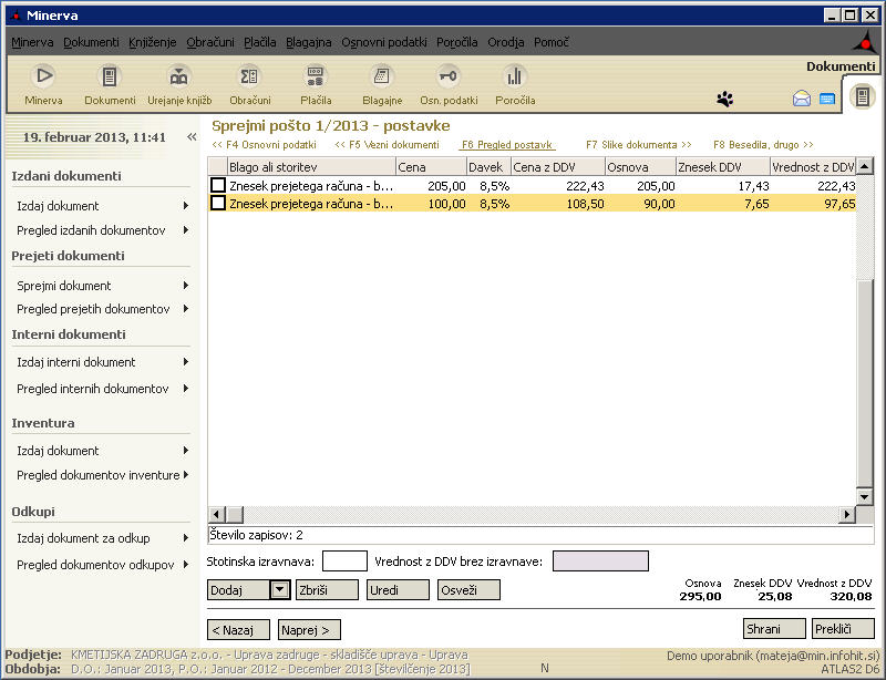 Modul Prejeta pošta lahko uporabljate za evidenco prejete pošte ali pa izkoristite možnost in z vnosom pošte hkrati kreirate tudi ustrezne dokumente v ustreznih modulih (npr. prejeti račun).